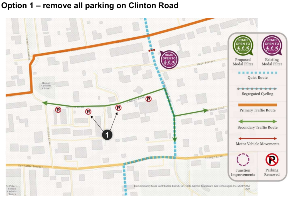 Option 1 preserves the existing set-up, but does nothing to address rat-running on Clinton Rd, Hope Tce and Blackford Rd, which residents have complained about