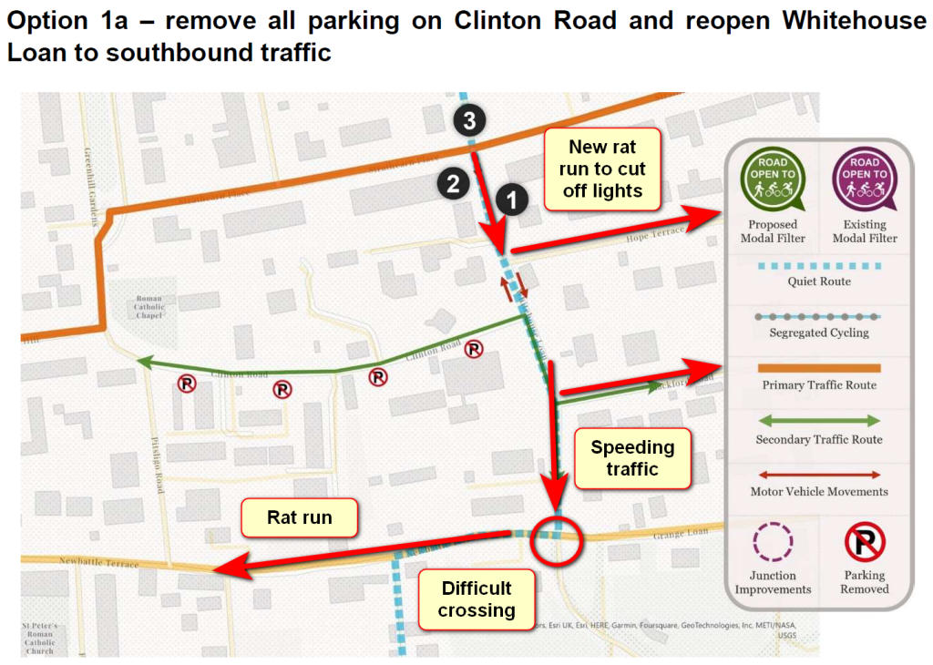 - creates new rat runs along Hermitage Gdns / Cluny Dr and for option 3, the entire estate becomes a rat-run